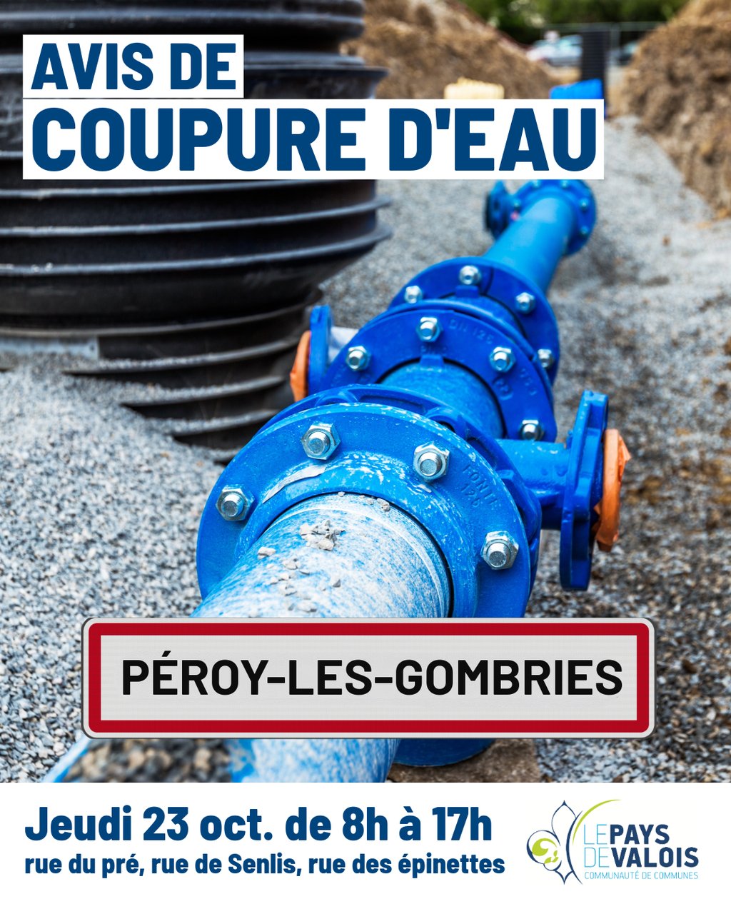 En raison de travaux sur le réseau, l'alimentation en eau potable sera interrompue à Péroy-les-Gombries dans les rues du Pré, de Senlis, des épinettes, le jeudi 23 octobre de 8h à 17h.